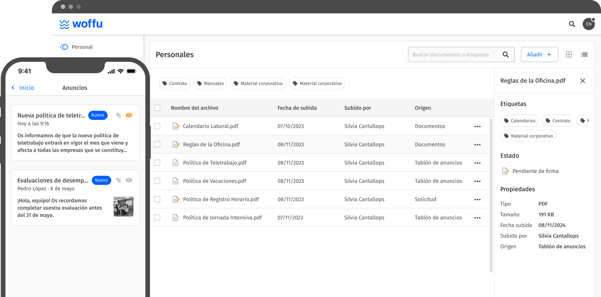 Woffu ofrece varias funcionalidades, destinadas a evitar procesos ineficientes. Permite administrar las ausencias y las vacaciones, registrar la presencia y llevar un registro horario (a través del fichaje digital o biométrico). Organiza también los diferentes turnos de trabajo en base a las necesidades del negocio, a través de un calendario. Asimismo, permite compartir nóminas, adjuntar y firmar documentos y enviar mensajes a través del tablón de anuncios, lo que mejora la comunicación interna de la compañía. Además, elabora informes relevantes para el departamento de RR.HH.