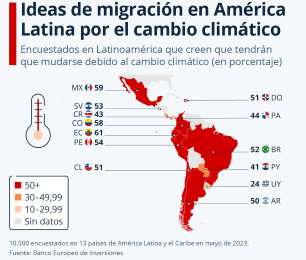 Un sondeo realizado en mayo de 2023 por el Banco Europeo de Inversiones señala que alrededor de la mitad de los encuestados en Latinoamérica creen que podrían tener que trasladarse a otra región o país debido al cambio climático, como lo muestra la presente infografía de Statista.