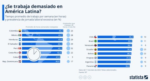Mientras el debate por la reducción de la jornada de trabajo continúa, la presente infografía de Statista muestra que las personas empleadas en Colombia trabajan más de 44 horas por semana, un promedio que sitúa al país entre los más altos de América Latina, seguido por México y Honduras, de acuerdo con datos de la Organización Internacional del Trabajo (OIT).