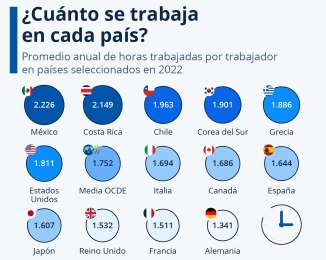 Cifras de la OCDE refieren que los mexicanos son los que más horas se pasan en su puesto laboral, con un promedio de 2.226 anuales, mientras que Alemania es donde se trabajan menos horas de media, esto es 1.341 al año.